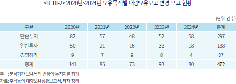이러한 이유로 최근 5년간 우리나라의 대량보유보고 가운데 보유 목적을 변경한 현황을 보면 의결권이나 신주인수권 외에는 아무런 주주권을 행사하지 않는 단순투자가 가장 많고, 적극적으로 주주권을 행사할 수 있는 경영참여 목적으로 변경한 경우는 37건(7.8%)에 불과하다. 이는 법적 불확실성이 소극적 주주권 행사로 이어질 수 있음을 시사한다.