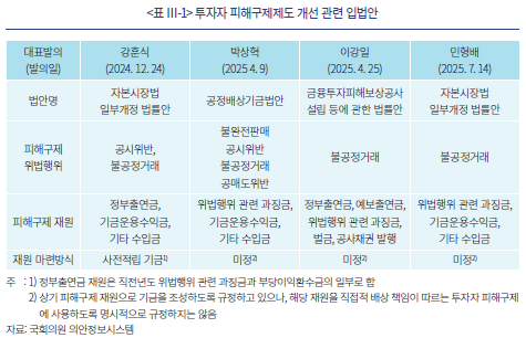 제22대 국회에서도 투자자 피해구제제도 개선을 위해 4개 입법안이 제출된 상태다. 이들 입법안을 자세히 들여다보면 <표 Ⅲ-1>에서 살펴볼 수 있듯이 공시위반 또는 불공정거래에 따른 투자자 피해에 대한 구제 공백을 해소해야 한다는 공통의 목적을 가지고 있다.