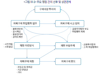 따라서 현행 투자자 피해구제제도를 개선하고자 할 때에는 복잡하게 얽힌 주요 쟁점 간 선후 및 상관관계를 고려하여 주요 쟁점을 정합적으로 검토할 필요가 있으며, 배상과 보상의 개념을 명확히 구분함으로써 가해자 부담 원칙의 준수와 재원 부담의 형평성을 동시에 달성하는 방향으로 투자자 피해구제제도가 개선되어야 한다.