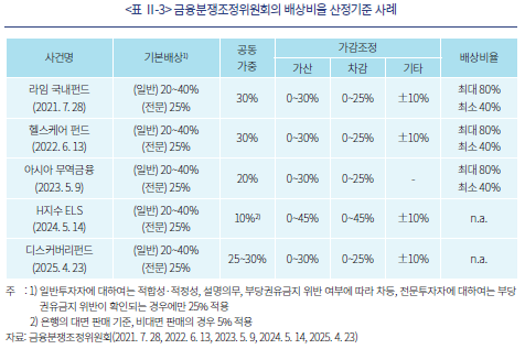 상기의 자율배상제도는 금융분쟁조정위원회가 동일 사건의 모든 분쟁조정 신청을 처리할 수 없는 행정적 한계를 해소하고 투자자 피해를 신속하게 구제할 수 있는 방안이라는 점에서 긍정적이다.20)21) 그러나 투자자 입장에서 자율배상제도는 금융분쟁조정위원회의 조정 결정에서 배제되고 이해당사자인 금융회사를 직접 상대해야 한다는 점에서 부정적인 측면도 있다. 또한 투자자에게 불리한 배상비율이 적용되는 경우도 있다(뉴스1, 2025. 9. 2; 연합뉴스, 2025. 11. 24).22)
