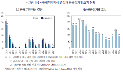 우리나라에서 금융소비자보호법, 자본시장법 등 금융관계법규 위법행위로 투자자 피해가 발생하는 사건은 매년 꾸준하게 적발되고 있다. <그림Ⅱ-1>에 나타난 바와 같이 2010년부터 2024년 6월말까지 금융분쟁조정위원회가 투자자 피해에 대해 금융회사에게 배상을 결정한 조정 건이 70건, 2010년부터 2024년까지 금융감독원이 불공정거래 혐의로 조치한 건이 1,987건에 달한다. 이에 따른 투자자 피해규모가 정확하게 집계되지 않고 있으나 금융당국의 투자자 피해 방지를 위한 지속적 노력에도 투자자 피해가 계속 발생해왔다는 점은 주목할 만하다.