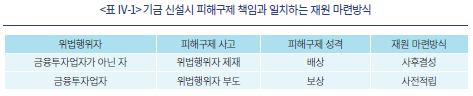 따라서 피해구제 기금을 신설하고자 할 때는 <표 Ⅳ-1>에서 제시하는 바와 같이 피해구제 성격과 구제재원 출처가 일치되도록 재원 마련방식을 결정하는 것이 필요하다.