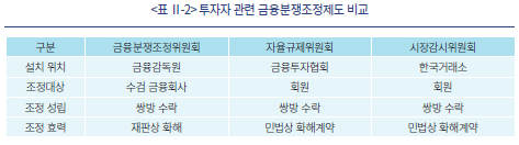 금융분쟁조정제도는 투자자가 행정적으로도 금융회사 등의 위법행위에 따른 피해에 대해 손해배상을 청구할 수 있도록 지원하는 제도로, <표 Ⅱ-2>에 나타난 바와 같이 금융감독원의 금융분쟁조정위원회, 금융투자협회의 자율규제위원회 및 한국거래소의 시장감시위원회에 의해 각각 운영되고 있다.4)