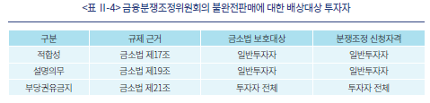 특히 이들 공시위반자 또는 불공정거래자는 자본시장법에 따라 금융위원회의 과징금 부과 등 제재 대상에 포함된다. 더구나 불공정거래자는 금융위원회의 조사 및 수사기관 고발대상이기도 하다. 그럼에도 금융감독원의 검사대상에 해당되지 않는다는 이유로 금융분쟁조정위원회의 조정대상에서 제외되어 민사소송 등 사법적 절차를 통해서만 피해를 구제받을 수 있다.