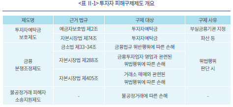 투자자는 민법에 따라 금융투자업자 또는 자본시장참여자의 채무불이행 또는 위법행위로 발생한 피해에 대해 사법적으로 손해배상을 청구할 권한을 가진다. 그러나 금융관계법규에서는 투자자 피해를 신속하게 구제함으로써 투자자의 재산권을 보호하고 투자자 신뢰기반을 강화하기 위해 <표 Ⅱ-1>에 나타난 바와 같이 별도의 투자자 피해구제제도를 마련하여 운영하고 있다.