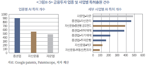 <그림Ⅱ-5>에는 금융투자 업종 및 사업별로 관련 있는 AI 기능을 포함한 특허의 건수가 정리되어 있다. 먼저 왼쪽 그래프에서 업종별로 특허 건수를 살펴보면, 증권업에서 AI 관련 특허가 가장 많이 출원된 것으로 나타났다. 800건이 넘는 특허가 증권업과 관련 있는 AI 기능을 사용하고 있어 금융투자업 전체에서 가장 활발하게 AI 활용 시도가 진행되고 있는 분야임을 보여준다. 자산운용업은 약 550건으로 두 번째로 많으며, 이어서 자문업이 약 480건 수준을 기록하였다.