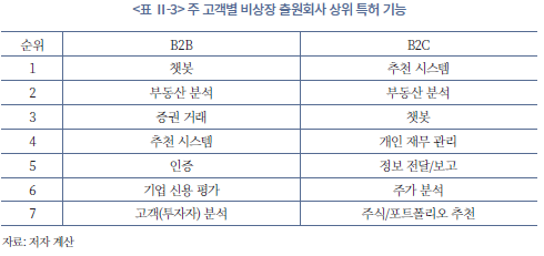 비상장기업의 특허를 해당 기업의 주요 고객 유형에 따라 분류하고, 관련 기능의 출원 빈도에 기반해 순위를 매겨보았다. <표 Ⅱ-3>을 보면, B2B 영역에서 가장 빈번하게 출원된 기능은 챗봇, 부동산 분석, 증권 거래, 고객 분석 등이었다. B2B 영역에서는 업무 효율화, 데이터 분석, 고객 지원 자동화 등 기업 내부 프로세스 개선을 위한 기능이 중심인 것으로 보인다. 예를 들어 챗봇은 고객 응대 자동화, 부동산‧증권 거래 분석은 투자 의사결정 지원, 신용평가‧투자자 분석은 기업 리스크 관리에 활용되는 기술이다. 반면 B2C 영역에서는 개인 투자자나 일반 고객에게 직접적인 가치를 제공하는 서비스형 기능이 중심이다. 특히 추천 시스템과 개인 재무 관리는 사용자의 투자 성향과 재정 상태에 맞춘 맞춤형 서비스를 지향하며, 챗봇은 개인 고객 응대 자동화, 주식‧포트폴리오 추천은 투자 의사결정 보조에 초점이 맞춰져 있다.