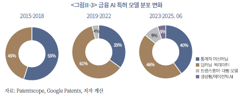 금융 AI 관련 특허의 기술 모델 분포에서 AI 기술의 발전에 따른 변화가 명확하게 드러난다. <그림Ⅱ-3>은 각 시기별로 출원된 특허문서에서 사용하고 있는 AI 모델을 분류하여 정리한 것이다. 2015년에서 2018년 사이에는 통계적 머신러닝(55%)과 딥러닝(45%)이 주류를 이루었다. 2019년에서 2022년 사이에 들어서는 딥러닝을 사용한 특허 비중이 61%로 확대되는 동시에, 트랜스포머 기반 대형 언어모델(4%)을 활용한 특허가 새롭게 등장하였다. 이어 2023년 이후에는 딥러닝(46%)과 통계적 머신러닝(40%)이 여전히 큰 비중을 차지하나, 트랜스포머 기반 대형모델(9%)과 생성형‧에이전틱 AI(5%)가 빠르게 성장하며 특허 생태계 내에서 새로운 축으로 자리 잡고 있다. 즉, AI 활용의 중심축이 통계형 모델에서 대형 언어모델, 나아가 자율적 의사결정이 가능한 에이전틱 AI로 점차 이동하는 추세이다.
