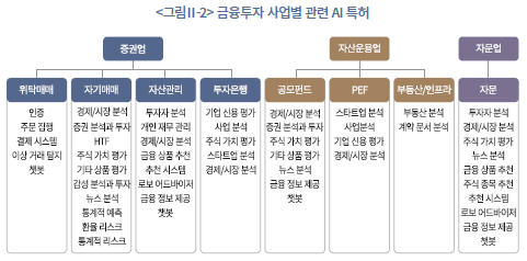 <그림Ⅱ-2>는 금융투자업 주요 사업 영역별로 연계된 AI 특허 기능을 체계적으로 정리한 결과를 보여준다. 금융투자업을 증권업, 자산운용업, 자문업으로 구분하고 각 산업 내 주요 사업 영역을 선정한 후, 특허 문서를 통해 파악한 AI 기능을 연결하였다.
