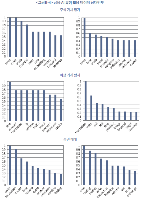 본 절에서는 AI 기술의 발전에 따라 금융 특허에서 활용되는 데이터의 종류가 어떻게 변화해 왔는지를 분석한다. 이를 위해 개별 특허 문서에서 재무제표, 뉴스, 사용자 음성 데이터 등 특허가 활용하고 있는 주된 데이터를 추출하고, 이를 시기별로 구분하여 기술 발전에 따른 데이터 활용의 확장 과정을 살펴보았다. 분석은 주식 가치 평가, 이상 거래 탐지, 증권 매매, 챗봇의 네 가지 주요 기능 영역을 대상으로 진행하였으며, 각 영역별 특허 문서에 나타난 데이터 관련 단어의 상대빈도를 산출하였다. 상대빈도는 특정 단어의 출현 빈도를 최빈 단어의 빈도로 나누어 정규화한 값으로, 최빈 단어를 기준값 1.0으로 설정하여 다른 단어들의 상대적 중요도를 비교할 수 있게 한다. <그림Ⅱ-4>는 금융 AI 특허 활용 데이터에 등장하는 상위 10개 단어의 상대빈도를 나타낸다.