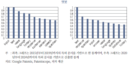 챗봇 관련 특허에서 활용되는 데이터 유형도 변화해 왔다. 초기 특허에서는 주로 ‘입력(input)’, ‘문자(text)’, ‘과거(history)’, ‘응답(response)’과 같은 데이터가 높은 비중을 차지하였다. 이는 사용자 입력, 대화 이력, 그리고 이에 대한 응답 로그가 챗봇 개발과 운영에서 핵심적인 데이터 자원으로 사용되었음을 보여준다. 이는, 고객이 입력하는 데이터를 주로 활용했음을 시사한다.