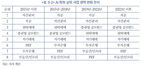 더불어 <표 Ⅱ-2>는 시기별 AI 특허의 상위 사업 영역 변화를 정리한 것이다. 이를 통해 확인할 수 있는 점은, AI 특허는 초기부터 활용도가 높았던 사업 영역에서 꾸준히 높은 수준을 유지하는 경향이 뚜렷하다는 것이다. 예를 들어, 자문 분야는 2010년대 중반 이후 현재까지 일관되게 최상위권을 차지하고 있으며, 자산관리 분야 역시 지속적으로 상위권을 유지하고 있다. 반면, PEF나 부동산‧특별자산 펀드 관련 분야는 상대적으로 낮은 순위에 머물며 비중이 크지 않은 것으로 나타났다. 이러한 결과는 AI 특허가 적은 영역에는 구조적인 제약 요인이 존재할 가능성을 시사한다.