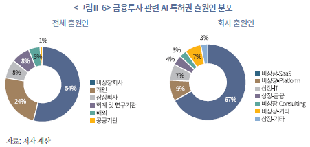 금융투자 서비스 관련 AI 특허 출원인은 비상장기업 중심으로 구성되어 있으며, 특히 비상장 SaaS 기업이 금융 서비스 영역에서 AI 도입을 선도하는 것으로 나타났다. <그림Ⅱ-6>의 왼쪽 그래프에서 전체 출원인 분포를 보면 비상장회사가 54%로 절반 이상을 차지하고, 개인 출원이 24%로 뒤를 이었다. 상장회사와 학계‧연구기관은 각각 8% 수준이었으며, 해외 기업과 공공기관의 비중은 상대적으로 낮았다. 이는 금융투자 분야 AI 기술 개발이 전통 금융회사보다는 민간의 혁신적 주체, 특히 스타트업 중심으로 전개되고 있음을 보여준다.