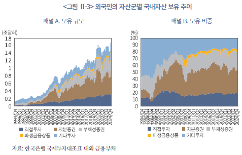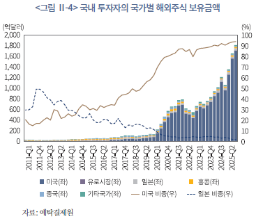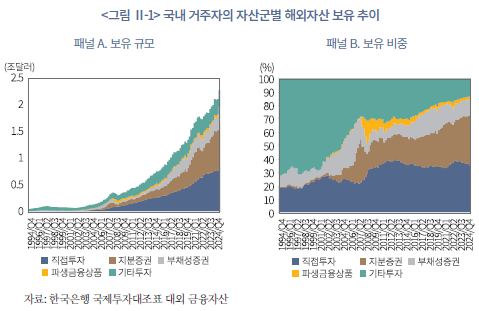 코로나19 이후 모바일 플랫폼의 확산으로 해외투자 접근성이 높아졌고, 글로벌 기술주 중심의 높은 수익률과 변동성, 낮아진 투자 장벽, 환율 상승에 대한 기대심리 등이 맞물리면서 개인투자자들이 본격적으로 해외 주식시장에 적극적으로 진입한 것으로 보인다. 그 결과, 과거 직접투자와 채권형 자산이 중심이던 구조는 점차 주식형 자산으로 이동하고 있으며, 2020년대 들어 개인과 비금융기업의 해외 지분증권 보유 비중이 빠르게 증가하였다.