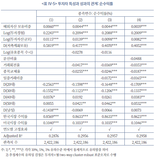 48) 월간 성과 지표의 노이즈와 단기 이벤트의 영향을 줄이고, 투자자 특성의 장기적 영향을 식별하기 위해 횡단면 자료로 추정한 결과를 보고한다. 본고에 보고하지 않았지만 투자자-월간 패널자료를 통해서도 유사한 시사점이 도출된다.