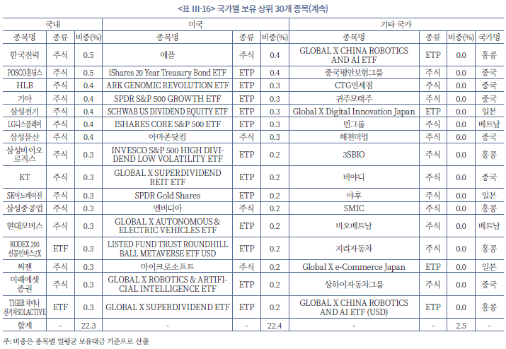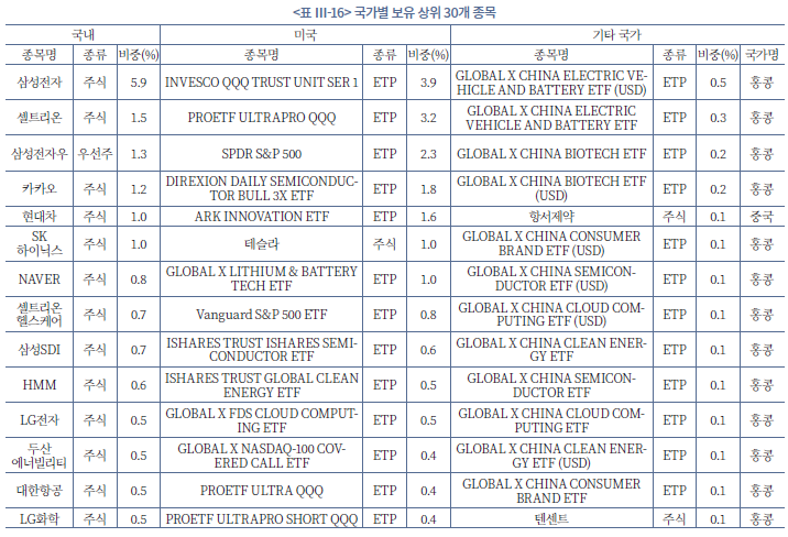 2020년부터 2022년까지 국내 투자자들의 보유 상위 30개 종목을 국가별로 분석한 결과, 국내는 대형주 중심의 직접투자, 미국은 ETF 중심의 간접투자 형태가 뚜렷하게 구분된다(<표 Ⅲ-16> 참조). 일평균 보유대금 기준으로 국내와 미국 종목의 상위 30개가 전체의 44.7%를 차지하였으며, 각각 22.3%와 22.4%로 유사한 수준을 보였다. 반면, 기타 국가의 상위 30개 종목은 전체의 2.5%에 불과하였으며, 일본과 베트남 등 신흥국 시장에서는 제한적이고 탐색적인 투자에 그쳤다. 국내 보유종목은 삼성전자, NAVER, 카카오 등 대형 성장주에 집중된 반면, 미국은 INVESCO QQQ Trust, SPDR S&P 500 ETF, ARK Innovation ETF 등 지수를 추종하는 ETF 위주의 간접투자 성향이 강하게 나타났다. 기타 국가는 홍콩 상장 ‘Global X China’ 시리즈를 중심으로 전기차, 반도체, 클라우드 등 4차 산업 관련 테마형 ETF에 대한 투자 비중이 높았다.