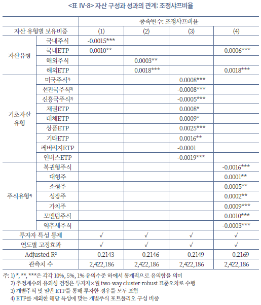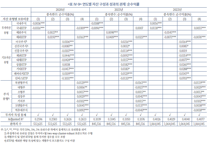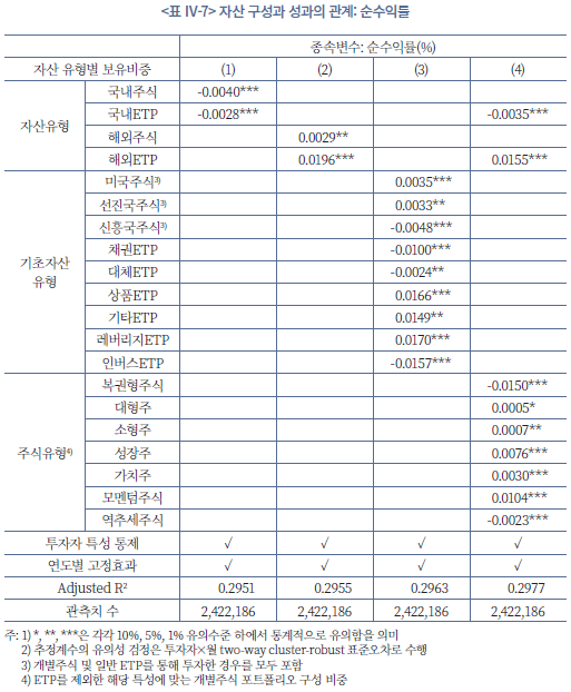 45) 시차 독립변수를 사용하고, 고정효과 등을 통제하더라도 쌍방향 인과관계의 가능성(예: 과거의 성과가 투자행태에 영향을 미치는 경우), 회귀분석에서 고려하지 못한 변수(예: 투자자 위험 선호도)의 누락, 수익률의 자기상관 등 회귀분석의 내생성은 여전히 남아 있다. 본고에서 사용한 분석 방법은 투자 행태와 성과 간의 동태적 피드백 효과 등을 완벽히 분리하기에는 한계가 있음을 밝혀둔다.