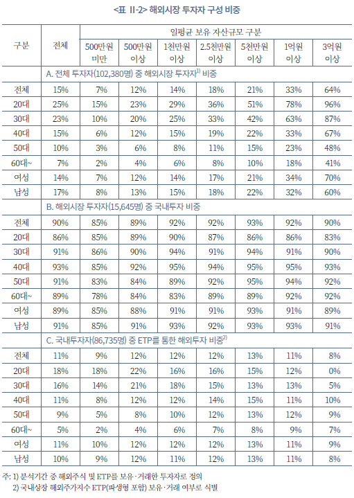 본고는 해외시장에 상장된 주식 및 ETP를 보유, 거래한 내역이 있는 투자자를 해외시장 투자자로 정의한다. <표 Ⅱ-2>에서 알 수 있듯이, 분석기간(2020~2022년) 중 해외 종목을 1회라도 보유하고 거래한 투자자는 전체 투자자 중 약 15%이다. 주로 30대 이하의 젊은 투자자 중 해외시장 투자자 비중이 높고, 자산규모가 클수록 해외시장 투자자 비중이 증가한다. 이러한 해외투자자의 대부분(약 90%)은 국내 자산 투자도 병행하는데, 이러한 특징은 투자자 특성과 무관하다. 그리고 국내시장 투자자 중 약 11%에 해당하는 일부 국내시장 투자자는 ETF 등을 통해 해외 주가지수 ETF 등에 투자하며, 이는 주로 소액투자자에게서 나타나는 특징이다. 본고에서는 국내자산 위주의 투자자라 할지라도 국내상장 해외지수 연동 ETP 등에 투자하는 개인은 해외시장 투자자로 분류하지 않고 국내투자자 집단에 포함시켜 분석을 진행한다. 이는 국내투자자의 포트폴리오 구성이 주로 국내주식 등 국내자산에 집중되어 있기 때문이다.