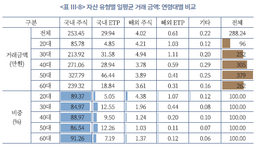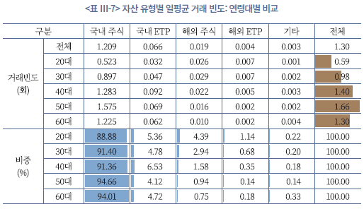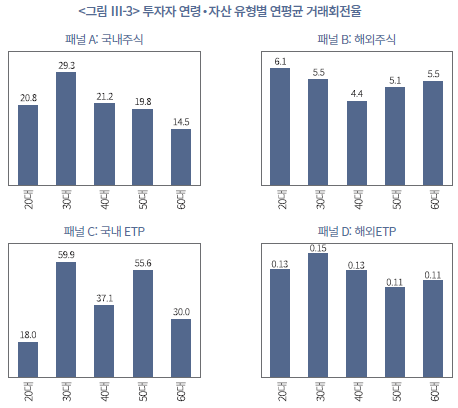 앞서 살펴본 보유 구조와 연계하여, 거래규모(<표 Ⅲ-7>, <표 Ⅲ-8> 참조)와 거래회전율(<그림 Ⅲ-3> 참조)을 보면, 연령대별 거래 행태는 보유자산 구성과 일관된 패턴을 보인다. 20대는 거래 빈도는 낮지만 회전율이 높고, 특히 해외주식과 해외 ETP 중심으로 거래가 활발하게 이루어진다. 이는 소규모 자금으로 다양한 해외 종목과 ETF를 시도해 보는 것이며, 경험 축적과 시장 탐색을 병행하는 단계로, 자본시장 차원에서는 새로운 투자수요 유입이라는 긍정적 효과가 있을 것으로 보인다. 단, 동시에 정보 비대칭과 경험 부족으로 인한 투자자 보호 이슈가 상대적으로 크게 대두될 소지가 있다. 30대는 거래 빈도와 회전율이 모두 가장 높은 연령대로, 국내 및 해외 주식‧ETP 전반에서 단기‧중단기 매매를 적극적으로 활용하는 고빈도, 고회전의 적극적 투자 행태가 뚜렷하다.