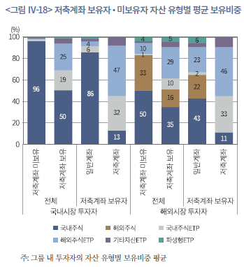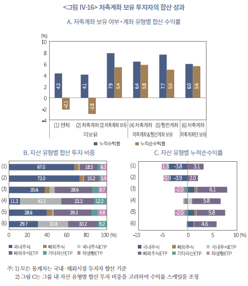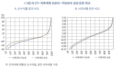 40) 저축계좌 보유 여부와 성과의 관계는 국내시장, 해외시장 투자자를 구분해도 질적인 차이는 없다. 또한 추가적인 분석 결과 저축계좌 내 편입 자산규모의 구성은 성과와 뚜렷한 관계는 없었다. 이는 저축성 계좌를 보유한 투자자가 그렇지 않은 투자자에 비해 투자 성향과 행태, 금융 이해력 등이 다른 것을 시사한다.