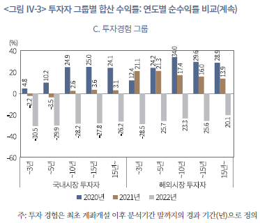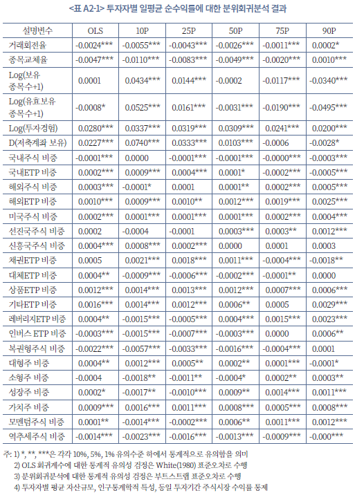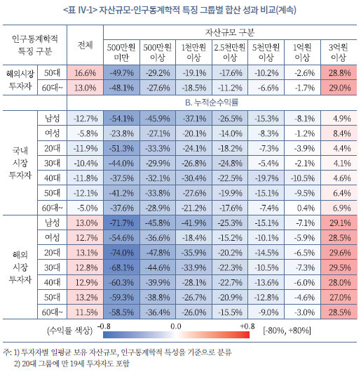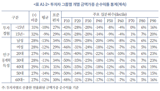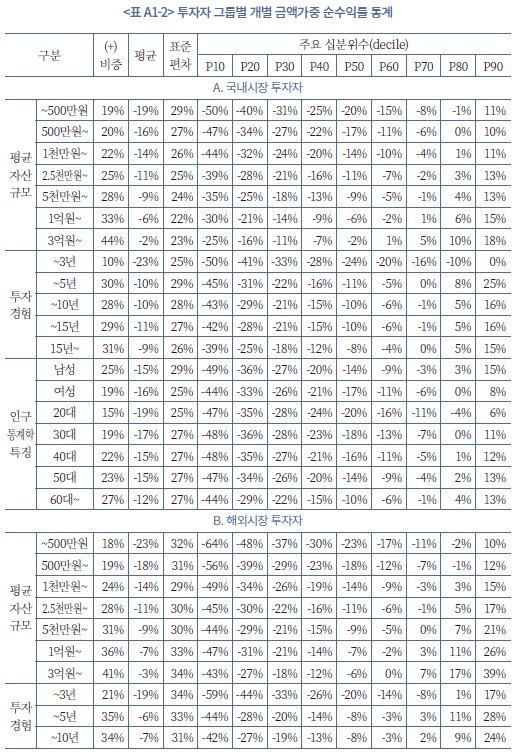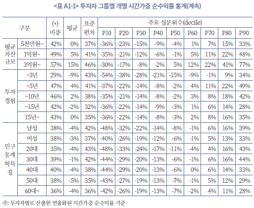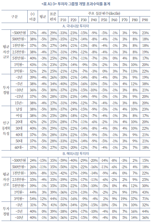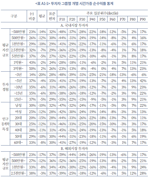 23) 투자자 유형 그룹별 개별 성과 지표에 대한 자세한 통계는 부록 1에 정리되어 있다.