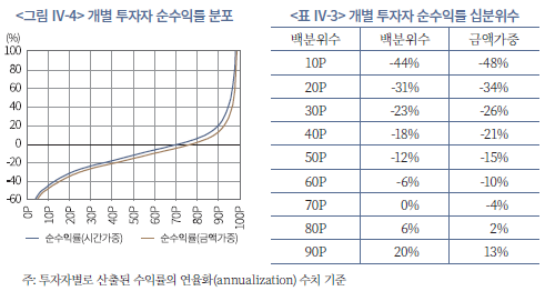 식(2)<그림 Ⅳ-4>는 전체 투자자 표본을 대상으로 연율화한 시간가중‧금액가중 순수익률의 분포를 백분위수를 통해 보여준 것이며, <표 Ⅳ-3>은 주요 십분위수를 요약한 것이다. 이를 통해 알 수 있듯이 투자자별 성과 편차는 매우 크게 나타나다. 전체 투자자 중 상위 10% 투자자의 수익률은 +20%(시간가중), +13%(금액가중)인 반면, 하위 10%는 –44%(시간가중), -48%(금액가중)로 차이가 크다. 금액가중 수익률로 계산 방식을 변경할 경우 투자성과가 전체적으로 하향 조정되는데, 이는 분석기간 내내 투자자들이 자산을 순매수했기 때문이다.22) 앞서 기간별 성과 분석에서 보여주듯 분석기간 후반부로 갈수록 성과가 하락하기 때문에, 금액가중수익률 기준으로 성과가 낮게 측정된다. 즉, 분석기간 실제 투자성과의 경제적 크기는 포트폴리오 수익률 대비 낮을 수 있다.