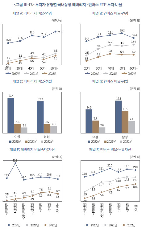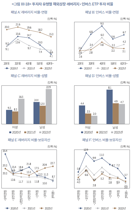 마지막으로, 2020년부터 2022년까지 ETP를 보유한 개인투자자의 특성에 따라 분석한 결과, 연령, 성별, 자산 규모별로 레버리지 및 인버스 상품 투자 비중에서 뚜렷한 차이가 나타났다(<그림 Ⅲ-17>, <그림 Ⅲ-18> 참조).