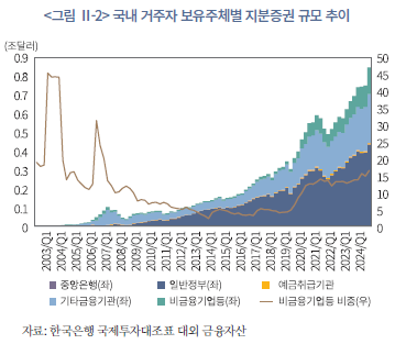 특히 지분증권을 보유주체별로 살펴보았을 때, 과거 일반정부와 기타 금융기관이 높은 비중을 차지했으나, 2020년 이후 이들의 비중은 급감하였다(<그림 Ⅱ-2> 참조). 대신 비금융기업 등 민간 부문의 지분증권 보유 비중이 약 4배 이상 증가하였으며, 이는 개인투자자의 해외투자가 급격히 확대되면서 대외투자 구조의 중심축으로 부상한 것이 영향을 미친 것으로 보인다.