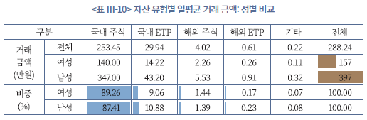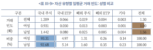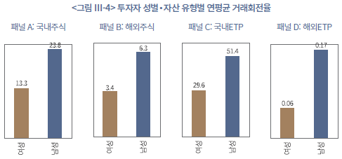 성별에 따른 거래 행태를 보면, 앞서 보유 구조에서 확인된 차이가 거래 패턴에도 그대로 반영된다(<표 Ⅲ-9>, <표 Ⅲ-10>, <그림 Ⅲ-4> 참조). 남성은 여성보다 일평균 거래 빈도, 거래 금액, 거래회전율이 전반적으로 높은 수준을 보인다. 과거 남성의 상대적인 과잉거래 성향을 실증한 선행연구와 유사한 분석 결과이다(김민기‧김준석, 2021; Barber & Odean, 2001). 특히 남성은 해외주식, 해외 ETP, 국내 ETP 등 변동성이 큰 상품에서 빈번하게 거래하는 경향이 있다. 이는 높은 수익 기회를 적극적으로 포착하려는 단기 및 중단기 투자 성향이 강하다는 의미이지만, 동시에 레버리지‧인버스형 등 고위험 ETP에 대한 노출이 크다는 점에서 손실 위험도 크게 내포하고 있다.