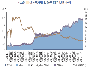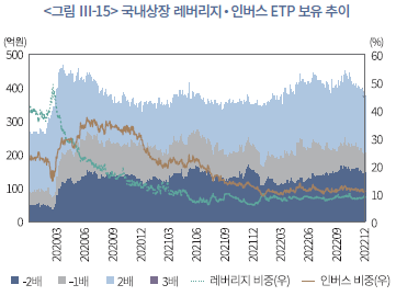 국내 ETP 보유 현황을 레버리지 및 인버스 배율별로 살펴보면(<그림 Ⅲ-15> 참조), 2020년 코로나19 발발 직후 시장 변동성이 급격히 확대되었던 시기에 레버리지‧인버스 ETP 보유가 크게 증가하였다가 이후 점차 축소되는 흐름을 보인다. 2022년 기준 국내 ETP의 약 72%는 기본 1배 상품으로 구성되어 있으며, 나머지 28% 가운데 인버스형이 11.0%, 레버리지형이 8.9%를 차지한다. 이는 국내 시장에서는 지수 추종형 1배 ETF가 기본적인 투자수단으로 활용되고, 단기적인 지수 등락이나 방향성 변화에 대응하기 위해 상승과 하락 양방향 레버리지 및 인버스 상품을 보조적으로 활용하는 성향이 존재함을 시사한다. 단, 국내 ETP 시장에서 일부 3배 레버리지 상품이 관측되는데, 이는 2022년 채권을 기초자산으로 하는 ETN에 한해 레버리지 배율을 ±3배까지 허용하는 규정을 도입한 데 기인한 것으로 전체 상품에서 차지하는 비중은 극히 제한적이다.