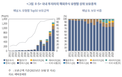 게다가 투자자의 보유종목 유형별 구성을 보면, 일반주식의 비중이 약 70~80% 수준으로 유지되고 있으나 2020년 이후 레버리지‧인버스 ETF 등 고위험 파생형 상품의 비중이 점진적으로 확대되는 추세를 보이고 있다. 특히 Top 50 보유종목 내에서 레버리지‧인버스형 상품의 비중이 꾸준히 증가했는데, 이는 개인투자자를 중심으로 이들 상품에 대한 수요가 늘어났기 때문이다(<그림 Ⅱ-5> 참조). 이러한 변화는 단순한 해외주식 분산투자를 넘어, 개인투자자가 글로벌 자산시장에서 보다 적극적이고 투기적 성향의 포지션을 취하고 있음을 보여준다. 결과적으로 개인의 해외투자 구조는 미국 대형주 중심의 집중형 구조를 유지하면서도, 고위험 레버리지 상품을 통한 단기 수익 추구 경향이 혼합되는 양상으로 진화하고 있는 것으로 짐작된다.