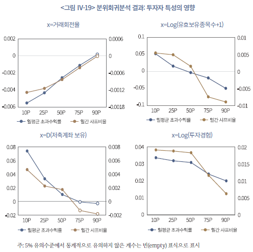47) 독립변수가 종속변수의 평균에 미치는 영향을 추정하는 OLS와 달리, 분위회귀분석은 종속변수의 분위(quantile)에 독립변수가 미치는 영향을 추정한다. 분위회귀분석은 종속변수의 분포가 정규분포가 아닐 경우, 일반 OLS에 비해 투자자별 이질성을 식별하고 설명하는 데 유의미한 정보를 제공할 수 있다.