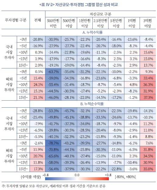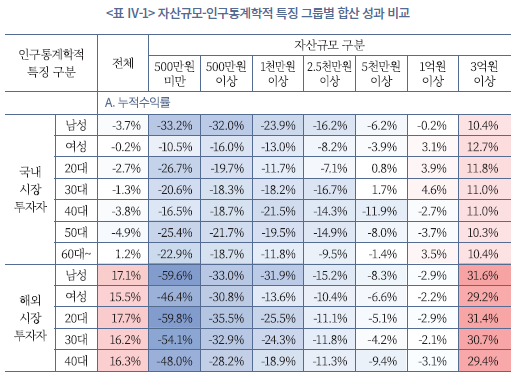 아래 표는 본고에서 분석한 개인투자자 표본을 국내‧해외시장 투자자로 구분한 뒤, 이를 인구통계학적 특징, 투자경험, 평균 자산규모를 기준으로 분류해, 각 그룹 내 개별 성과 측정치의 통계를 산출한 결과다.