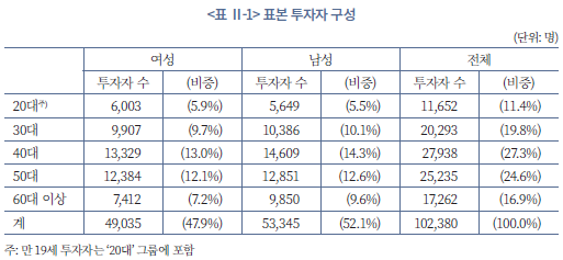 최종적으로 102,380명의 개인투자자 표본을 구축하였고, 인구통계학적 특징별 구성은 <표 Ⅱ-1>과 같다. 남성과 여성이 각각 52.1%, 47.9%이고, 연령대별로 보면 20대, 30대, 40대, 50대, 60대 이상이 각각 11.4%, 19.8%, 27.3%, 24.6%, 16.9%를 차지한다. 투자자 표본의 인구통계학적 구성은 우리나라 주식투자자 구성과 뚜렷하게 다르진 않으나6), 국내 증권사 고객의 표본 자료라는 점에서 결과의 대표성에 한계가 있을 수 있다. 또한, 본고의 분석기간인 2020~2022년은 코로나19, 유동성 확대 및 축소, 금리의 급격한 상승 이후 자산가격 조정 등 상승장과 하락장이 뚜렷한 분석기간에 해당된다. 이러한 특수한 환경이 개인투자자의 행태와 성과를 분석하기에 적합할 수 있으나, 분석 결과가 다소 국면 의존적일 수 있음을 밝혀둔다.