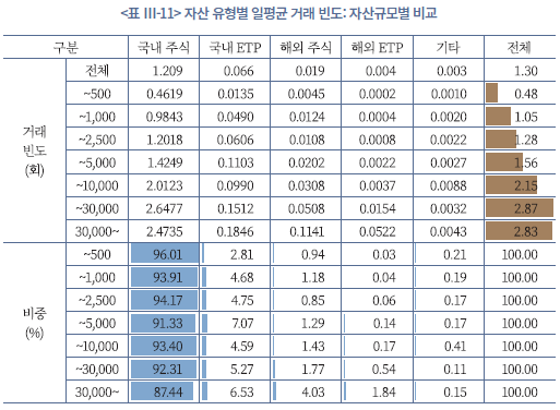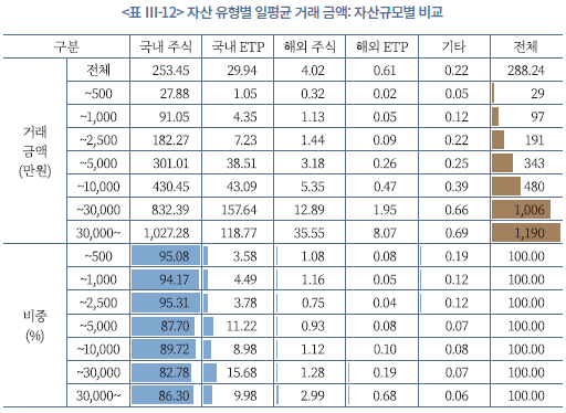 자산규모별 거래 행태를 살펴보면(<표 Ⅲ-11>, <표 Ⅲ-12>, <그림 Ⅲ-5> 참조), 먼저 자산 규모가 커질수록 일평균 거래 빈도와 거래금액이 함께 증가하는 뚜렷한 규모효과가 나타난다. 전체 평균 거래 빈도는 1.3회이지만 500만원 이하 투자자는 0.48회, 3억원 초과 투자자는 2.83회로, 고액투자자가 하루에 두 배 이상 더 자주 거래한다. 거래금액 역시 500만원 이하 그룹이 일평균 29만원인 반면, 3억원 초과 그룹은 1,190만원으로 약 40배 수준이다. 다만 거래의 대부분은 모든 자산구간에서 공통적으로 국내주식에 집중되어 있으며, 자산 규모가 커질수록 국내주식 비중이 다소 낮아지고 국내 ETP와 해외자산 비중이 점진적으로 늘어나는 정도에 그친다.