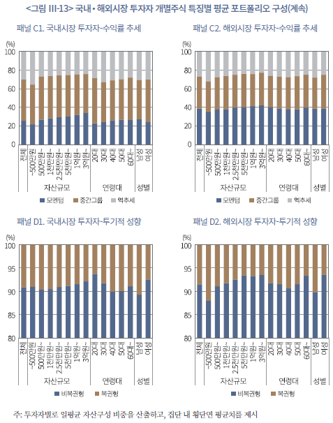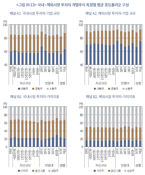 <그림 Ⅲ-13>은 국내시장 및 해외시장 투자자를 세부 투자자 특성별 그룹으로 나눠, 각 그룹 내 투자자의 평균 주식 포트폴리오 구성을 앞서 정의한 주식의 특징별로 구분하여 정리한 것이다. 먼저 기업 규모를 보면 두 집단 모두 평균적으로 대형주의 비중이 높다. 그러나 해외시장 투자자(평균 71%)가 국내시장 투자자(평균 60%)에 비해 대형주 비중이 높고, 남성보다 여성 투자자가, 고연령대보다 저연령대 투자자가 대형주를 상대적으로 더 높은 비중으로 보유하고 있다. 이는 여성 투자자의 보수적 성향, 저연령대 투자자의 미숙한 투자 경험이 반영된 결과로 판단되며, 해외시장 투자의 경우 정보 비용 등으로 인해 시장 대표종목 비중이 높은 것이 반영된 결과로 보인다. 이러한 특성은 가치지표별 분포와도 일정 부분 연계되어 있지만, 전체적으로 해외시장 투자자의 성장주 비중(평균 51%)이 국내시장 투자자(평균 34%)보다 높다. 이는 유수의 거대 기술기업 등 분석기간 미국 주식시장의 상승을 견인한 종목이 대부분 성장주로 분류되기 때문이다. 마찬가지 주가 모멘텀을 기준으로 보면, 성장주 투자 비중이 높은 해외시장 투자자 그룹에서 과거 수익률이 높은 모멘텀 주식의 비중(평균 39%)이 국내시장 투자자(평균 26%)보다 높게 나타난다. 기업가치 및 수익률 추세 지표의 경우 연령대 및 성별 그룹 간에는 유의미한 차이는 관찰되지 않는다. 마지막으로 투기적 성향을 대표하는 복권형 주식 투자 비중을 보면, 평균적으로 국내, 해외시장 투자자 모두 주식 포트폴리오 내 10% 미만이다. 그러나 해외시장 투자자의 경우 소액투자자일수록, 국내‧해외시장 투자자 집단 모두 남성 투자자일수록 투기적 성향이 강한 종목의 평균 투자 비중이 상대적으로 높게 관찰된다. 이들 집단에서 보다 공격적인 투자 성향이 존재하는 것을 예상할 수 있다.