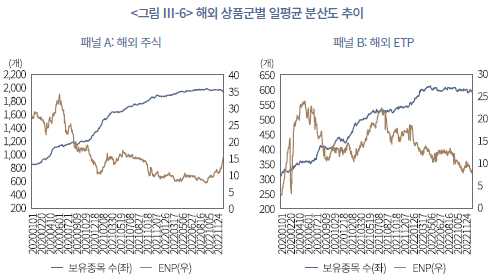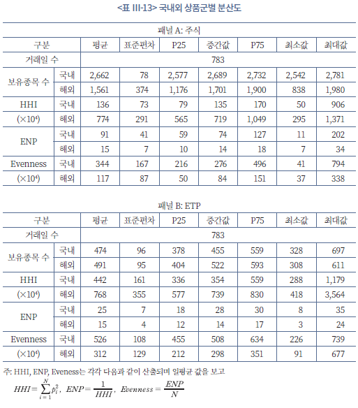 <표 Ⅲ-13>의 패널 B는 ETP에 대한 분산도를 보여준다. 국내 ETP의 경우 평균 보유종목 수는 474개, ENP는 25개이며, 균등도는 네 상품군 중 가장 높은 수준을 나타낸다. 이는 투자자가 선택한 국내 ETF 내부에서는 상대적으로 비중이 고르게 분산되어 있음을 시사한다. 반면 해외 ETP는 보유종목 수가 국내 ETP와 유사함에도 HHI가 더 높고 ENP가 15개 수준에 그쳐, 소수의 특정 ETF에 자금이 집중된 구조를 보인다. 종합하면, 개인투자자는 국내 ETP에서는 비교적 분산된 포트폴리오를 운용하는 반면, 해외주식과 해외 ETP에서는 고집중 포트폴리오를 운용하고 있다.