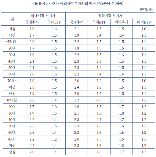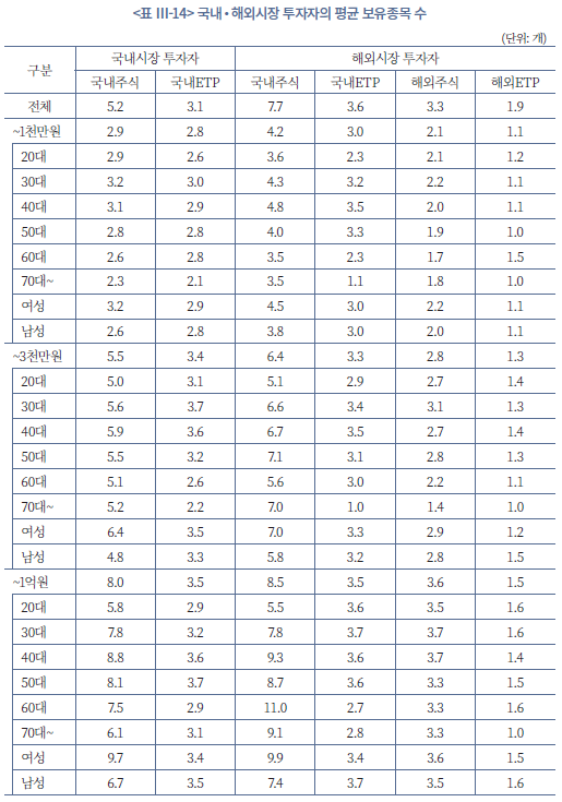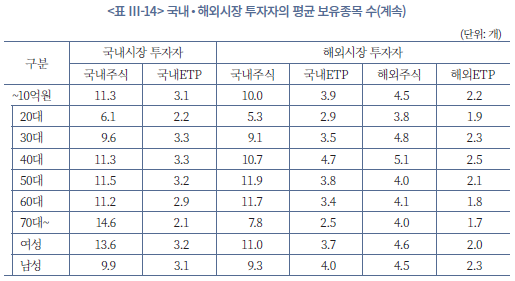 투자자 유형, 자산규모, 연령, 성별에 따라 명목상 보유종목 수는 상당한 차이를 보이지만, ENP 기준 실질 분산도는 거의 차이가 나지 않는다는 점이 확인된다(<표 Ⅲ-14>, <표 Ⅲ-15> 참조). 먼저 평균 보유종목 수를 보면, 국내시장에만 투자하는 투자자의 국내주식 보유종목 수는 전체 기준 5.2개인데 비해 해외시장에 자산을 보유한 투자자는 이보다 더 많은 7.7개를 보유하고 있다. 또한 자산규모가 커질수록 이 격차는 더 벌어져, 10억원 이상 구간에서는 국내시장 투자자가 국내 주식 11.3개를 보유하는 반면 해외시장 투자자는 14.5개의 주식과 6개 이상의 ETP를 추가로 보유하는 것으로 나타난다. 연령 및 성별로도 30~40대, 여성 투자자가 같은 자산구간의 다른 집단에 비해 더 많은 종목을 편입하는 등 표면적인 종목 개수만 보면 해외시장 투자자, 고액투자자, 여성 투자자가 더 넓게 분산투자하고 있는 것으로 보인다.