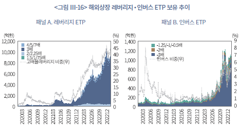 한편 해외 ETP의 경우 전체의 77%가 1배 상품으로 구성되어 있어 겉으로는 안정적인 지수 추종형 투자가 중심인 것처럼 보인다. 그러나 나머지 23% 가운데 3배 레버리지 ETF 비중이 81.1%에 달해, 남은 몫의 대부분이 고배율 상품에 집중되어 있다(<그림 Ⅲ-16>의 패널 A 참조). 인버스형 역시 –3배 이상 고배율 상품의 비중이 크게 확대된 것으로 나타난다. 이러한 현상은 비중 측면뿐 아니라 절대 규모 측면에서도 두드러져, 해외 레버리지‧인버스 ETP 보유 규모는 국내 시장의 4배를 상회하며, 2022년으로 갈수록 국내 ETP 시장과 달리 보유규모와 비중이 가파르게 증가한다(<그림 Ⅲ-16>의 패널 B 참조). 종합하면, 해외 ETP 투자에서는 소수의 고위험 레버리지‧인버스 상품을 통해 공격적인 방향성 베팅을 수행하는 행태가 강화되었다.