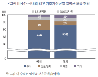 <그림 Ⅲ-14>의 국내외 ETP 기초자산별 보유 현황에 따르면, 국내 ETP 총보유액 1,318억원 중 주식형 자산이 1,183억원으로 약 90%를 차지한다. 상품 및 통화형은 6.7%, 채권형은 2.1%, 기타는 1.4%에 그쳐, 국내 ETP 투자가 사실상 국내 주가지수에 연동된 구조임을 볼 수 있다.