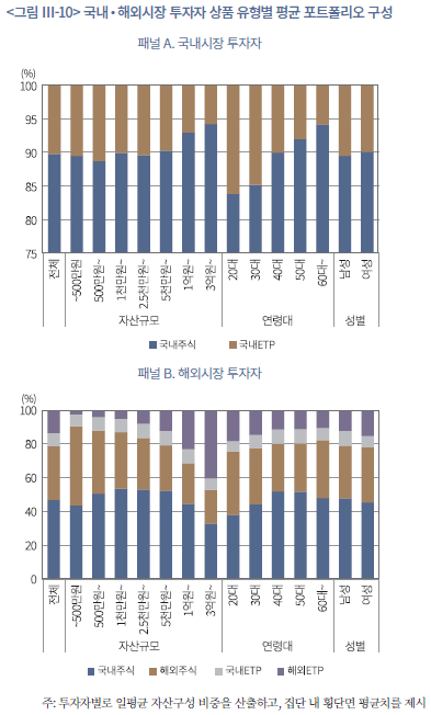 투자자 그룹별 포트폴리오 구성을 살펴보자. <그림 Ⅲ-10>은 국내시장 투자자와 해외시장 투자자를 자산규모, 연령대, 성별을 기준으로 구분한 집단의 상품 유형별 평균 구성 비중을 보여준다. 그룹별 평균 포트폴리오 구성은 전체 집단의 구성과 전반적으로 유사하나, 국내시장 투자자의 경우 고액투자자일수록, 고연령대일수록 개별주식의 비중이 높다. 한편 해외시장 투자자는 소액투자자일수록 해외주식의 비중이, 고액투자자는 해외 ETP의 비중이 높다. 그리고 저연령대일수록 ETP의 평균 비중이 소폭 높게 나타난다.