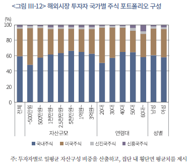 이번엔 해외시장 투자자 그룹에 대해 개별주식 포트폴리오의 국가별 비중을 간략히 살펴보자(<그림 Ⅲ-12> 참조). 앞서 ‘나’절에서 확인하였듯이, 해외시장 투자자의 개별주식 포트폴리오는 대부분 국내주식과 미국 상장주식이 구성하고 있다. 특히 이러한 경향은 소액투자자, 20~30대 젊은 투자자 그룹에서 상대적으로 강화되는 모습이 보인다.