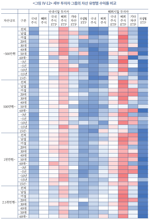 즉, 소액투자자는 국내 주식 비중이 높은 집중형 포트폴리오를 보이는 반면, 일정 규모 이상의 고액투자자는 국내외 주식과 ETP를 병행하는 분산형 투자자에 가깝다. 3억원 초과 고액투자자의 경우 해외 ETP를 포트폴리오의 핵심 축으로 활용하는 글로벌 자산관리형 투자 성향이 뚜렷하게 나타난다.