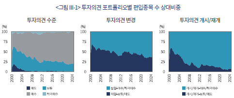 본장에서는 개별 투자의견과 개별 목표주가를 이용한 포트폴리오의 초과수익률을 분석한다. 먼저 개별 투자의견 포트폴리오의 편입종목 수의 상대적 비중에 대해 살펴보자. <그림 III-1>의 좌측 그림은 투자의견 수준별 포트폴리오의 편입종목 수의 상대 비중 추이를 보여준다. 매수의견 포트폴리오의 편입종목 수가 2012년까지 빠르게 증가한 이후 증가세가 둔화되는 패턴이다. 매수의견 포트폴리오의 편입종목 수는 2000년 380종목에서 2024년 563종목으로 늘고, 보유의견 포트폴리오의 편입종목 수는 같은 기간 402종목에서 134종목으로 크게 준다. 이는 애널리스트의 투자의견이 매수로 편중되어 온 데 따른 결과다. 가운데 그림과 우측 그림은 투자의견 변경 포트폴리오와 개시/재개 포트폴리오의 편입종목 수 상대 비중인데, 투자의견 매수/적극매수 포트폴리오의 편입종목 수가 증가하는 추세를 확인할 수 있다. 이 역시 애널리스트의 투자의견이 매수로 편중되는 추세에 따른 결과이며, 투자의견 개시/재개에서 더욱 두드러진다.