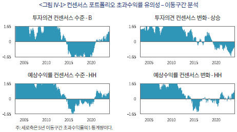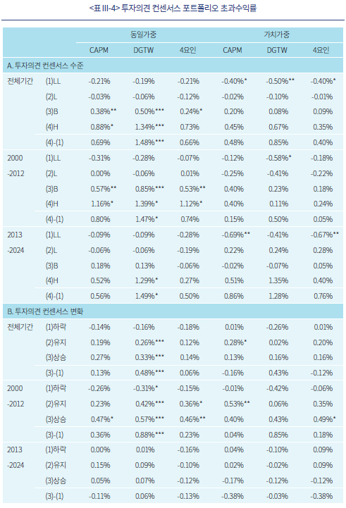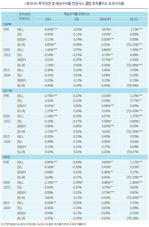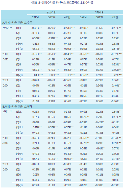 <표 III-5>는 예상수익률 컨센서스의 수준과 변화에 따라 구성한 포트폴리오의 초과수익률을 기간, 벤치마크, 수익률 가중방식에 따라 제시하고 있다. 결과는 앞선 분석결과와 유사하게, 2013년 이후보다 2012년 이전 표본에서, 가치가중보다 동일가중 방식에서 유의성이 관찰된다. 컨센서스 수준 포트폴리오에 대한 결과 A에서, 2012년 이전-CAPM-동일가중의 결과를 보면, 컨센서스 수준이 높을수록 초과수익률이 높고, LL, H, HH 포트폴리오의 초과수익률이 각각 –0.72%, 0.50%, 0.69%로 통계적으로 유의하다. 또한 HH-LL 롱숏 포트폴리오((4)-(1))의 초과수익률도 1.04%로 유의하다. 벤치마크를 변경하더라도 결과는 유사하다. 반면, 편입종목 수익률을 가치가중하는 경우 유의성이 하락하며, 2013년 이후 표본에서는 컨센서스 수준, 벤치마크, 수익률 가중방식과 무관하게 유의한 결과를 찾아보기 어렵다.