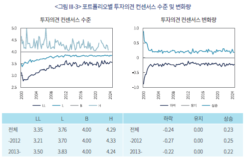 컨센서스 변경 포트폴리오에 대한 B의 결과는 A에 비해 유의성이 낮은 가운데, 전체기간과 2012년 이전, 동일가중 방식에서 HH 포트폴리오와 HH-LL 롱숏 포트폴리오의 유의한 초과수익률이 관찰된다. 편입종목 수익률을 가치가중하는 경우 컨센서스 변화량과 초과수익률의 관계가 선형적이지 않고 H에서 음(-)의 초과수익률, L에서 양(+)의 초과수익률이 관찰되어 컨센서스 변경 정보의 신뢰성을 확인하기 어렵다.