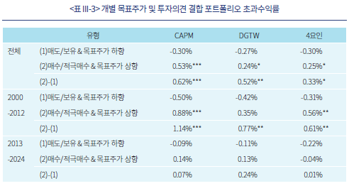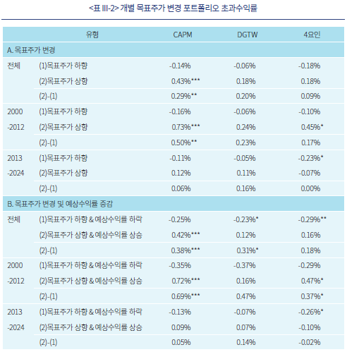 <표 III-2>는 개별 목표주가 변경 정보를 이용하여 구축한 포트폴리오의 초과수익률에 대한 결과다. A의 목표주가 상향 및 하향 포트폴리오에 대한 결과에 따르면, 목표주가 하향보다는 상향에서, 2012년 이전 표본에서 초과수익률의 유의성이 관찰된다. 그러나 벤치마크가 DGTW, 4요인모형인 경우 유의성이 낮아 강건성을 확인하기는 어렵다.