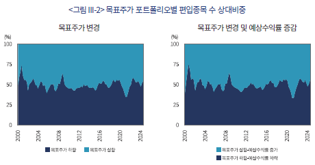<그림 III-2>는 개별 목표주가 변경 포트폴리오별 편입종목 수의 상대비중 추이를 보여준다. 좌측은 목표주가 변화만을, 우측은 목표주가 변화와 예상수익률 증감을 함께 고려한 경우인데, 목표주가 상향 포트폴리오와 하향 포트폴리오의 편입종목 수가 대체로 유사하다. 목표주가 상하향 빈도의 차이가 크지 않고 추세적 변화 또한 없었던 것으로 보인다. 다만, 2000년대 초 IT 버블, 2008년 글로벌 금융위기에 목표주가 하향이 급증하고 2020년 COVID-19 직후 목표주가 상향이 급증하는 모습이 관찰된다.