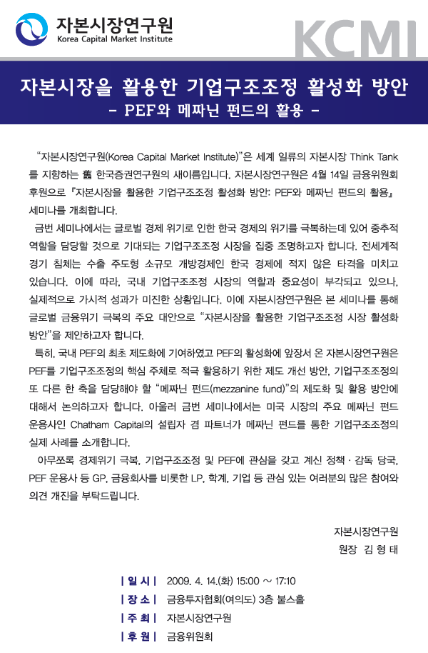 『자본시장을 활용한 기업구조조정 활성화 방안 - PEF와 메짜닌 펀드의 활용』세미나
